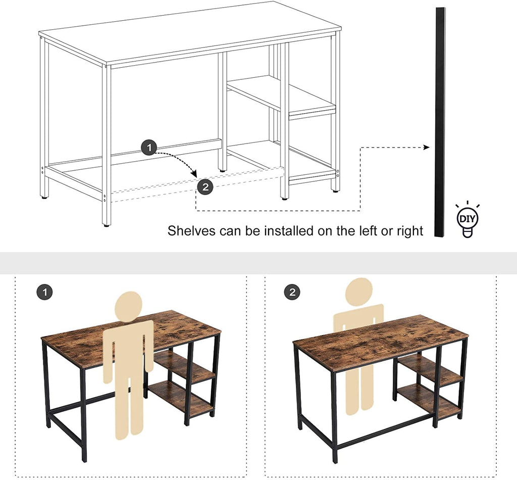 This tasteful, vintage-style computer desk unifies rigid metal with dark, wooden boards, resulting in a unique display of delicate charm; work at this vintage desk with the confidence that you made the right choice for your home. The writing desk comes with 2 shelves that can be assembled on the left side of the desk or the right, depending on your preference. Place your favorite books, decorations, or notes on the shelves for easy access. If you need room for a large computer tower, you can remove the top shelf for some extra space. The thicker metal frame (1.2mm), reliable wooden boards, and adjustable feet work to ensure that your computer desk is stable and won't wobble with every stroke of your pen or button pressed on your keyboard. With our easy to follow instructions and assembly tools, this computer desk will be built in a breeze.